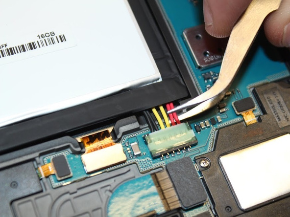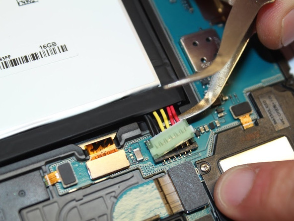 • Disconnect the battery. To do this you will need a small tool, such as a plastic opening tool or tweezers. Gently place a tool under the battery wires and pull upward until it is released from the port.
